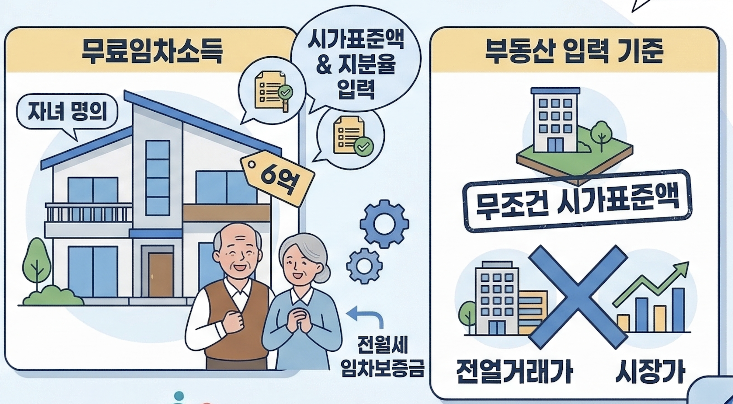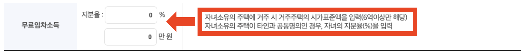 본인 소유의 집이 없더라도, 시가표준액 6억 원 이상인 자녀 명의의 주택에 거주 중이라면 '무료임차소득'이 발생합니다. 자녀의 주택 시가표준액과 지분율을 입력해야 합니다.