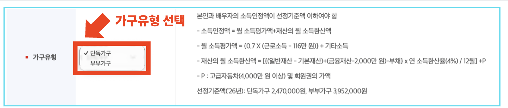 - 일반 신청자의 경우, 부부 중 한 명만 신청하더라도 법적 혼인 상태라면 반드시 '부부가구'를 선택해야 합니다.