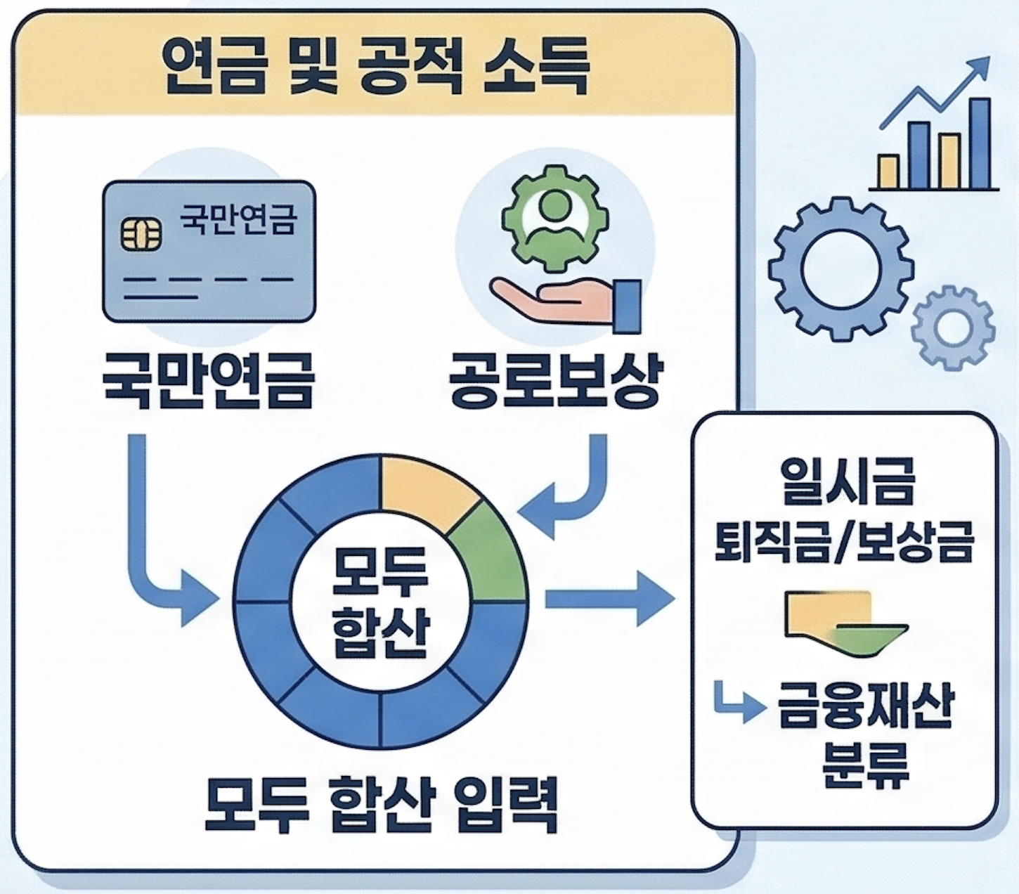 매달 정기적으로 받는 국민연금, 산재급여 등은 모두 '공적이전소득'칸에 합산하여 적습니다. 일시불로 받은 퇴직금이나 보상금은 소득이 아닌 '금융재산'으로 분류해야 합니다.