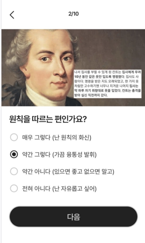 - 질문이 짧고 명확 – 고민 없이 슥슥 누를 수 있음