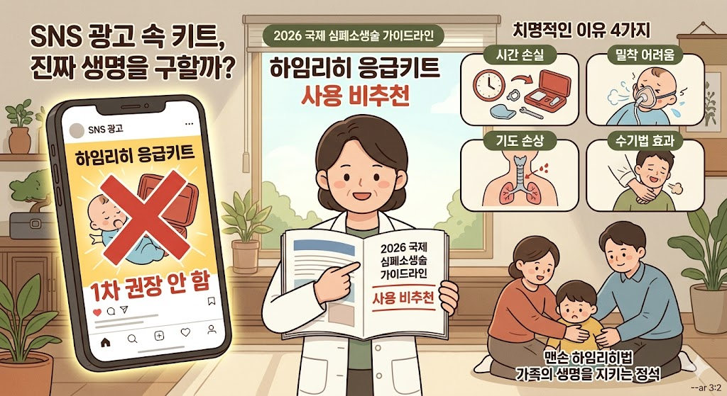 2026년 기준 하임리히 응급키트(기도 폐쇄 흡인기)의 실제 효과와 전문가들이 구매를 비추천하는 4가지 치명적인 이유를 분석합니다. 골든타임을 지키는 정확한 영유아 및 성인 하임리히법 응급처치 순서를 확인하고 위급 상황에 대비하세요.