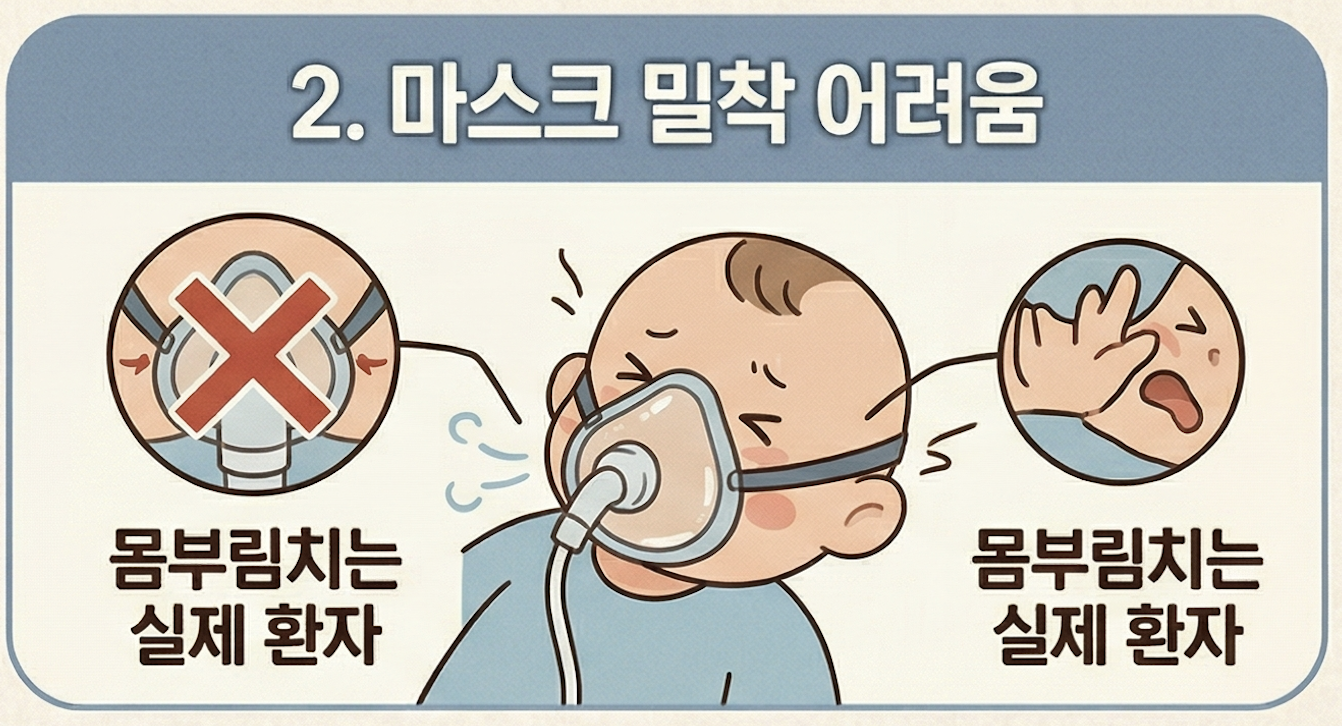 광고에서는 마네킹을 대상으로 쉽게 이물질을 뽑아내지만, 실제 기도 폐쇄 환자는 극심한 고통으로 강하게 몸부림을 칩니다. 이 상황에서 코와 입에 마스크를 완벽하게 밀착시켜 공기가 새지 않도록(음압 형성) 만드는 작업은 숙련된 의료진에게도 매우 어렵습니다. 약간의 틈이라도 발생하면 흡인력은 완전히 상실됩니다.