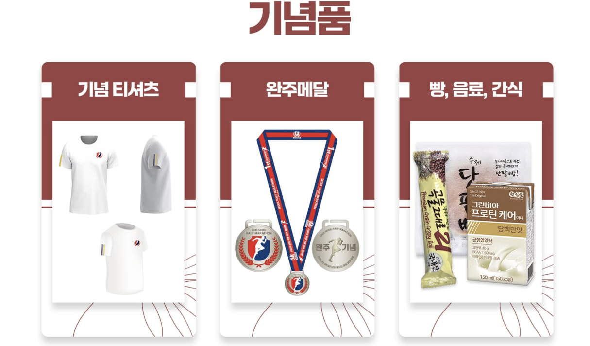 기념 티셔츠, 완주 메달, 기록증(하프·10km), 빵과 음료