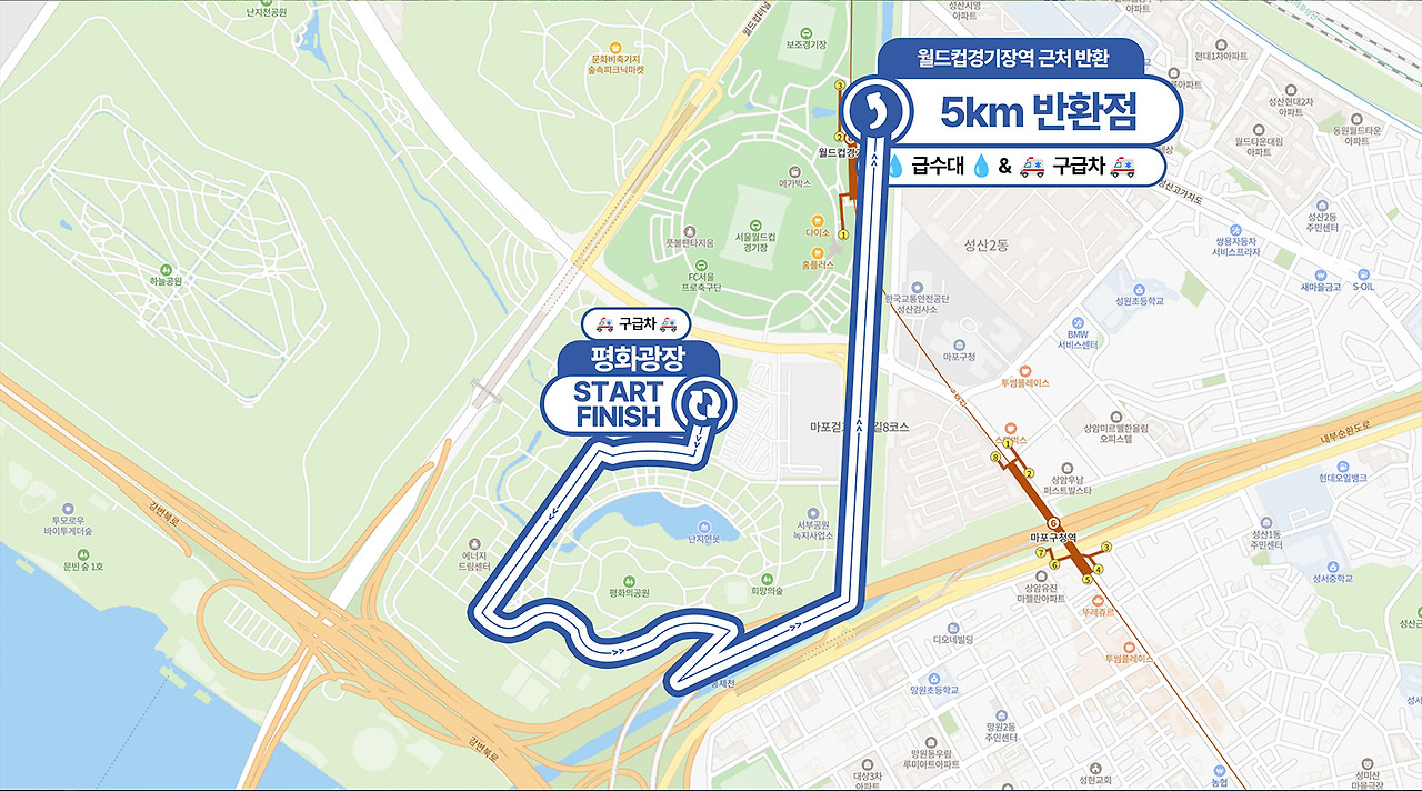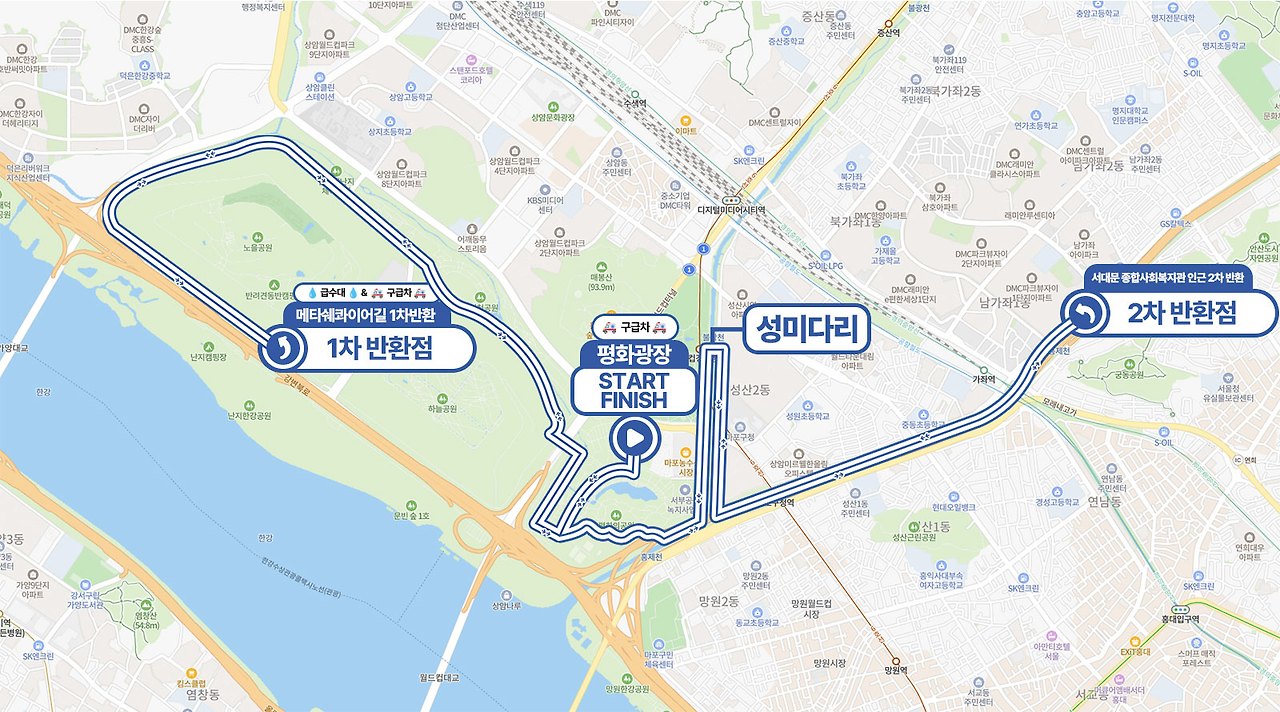 평화광장 → 별자리광장 → 하늘공원 → 난지천공원 다목적구장 버스정류장 → 노을공원길 → 메타쉐콰이어길 1차반환 → 노을공원길 → 하늘공원길 → 모험놀이터길 → 불광천 → 월드컵경기장역 (성미다리) → 마포구청역방향 → 사천교 → 홍제천길 → 서대문 종합사회복지관 인근 2차 반환 → 성미다리 →모험놀이터 → 별자리광장 → 평화광장