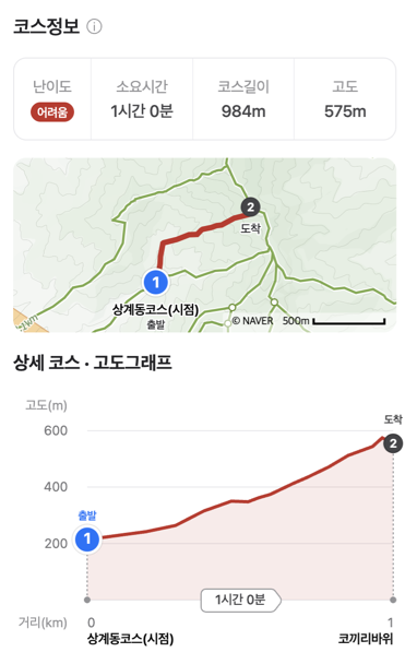 | 상계동 코스 | 0.984 | 60 | 575 | 어려움 | 암릉+코끼리바위 코스 |