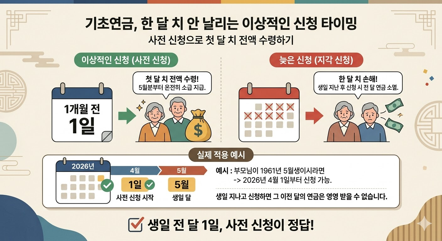 부모님이 1961년 5월생이시라면, 2026년 4월 1일부터 기초연금 신청이 가능합니다. 이렇게 사전 신청을 해두면 심사가 길어져도 5월분부터 온전히 소급하여 첫 달 치를 지급받을 수 있습니다. 생일이 지나고 신청하면 그 이전 달의 연금은 영영 받을 수 없습니다.