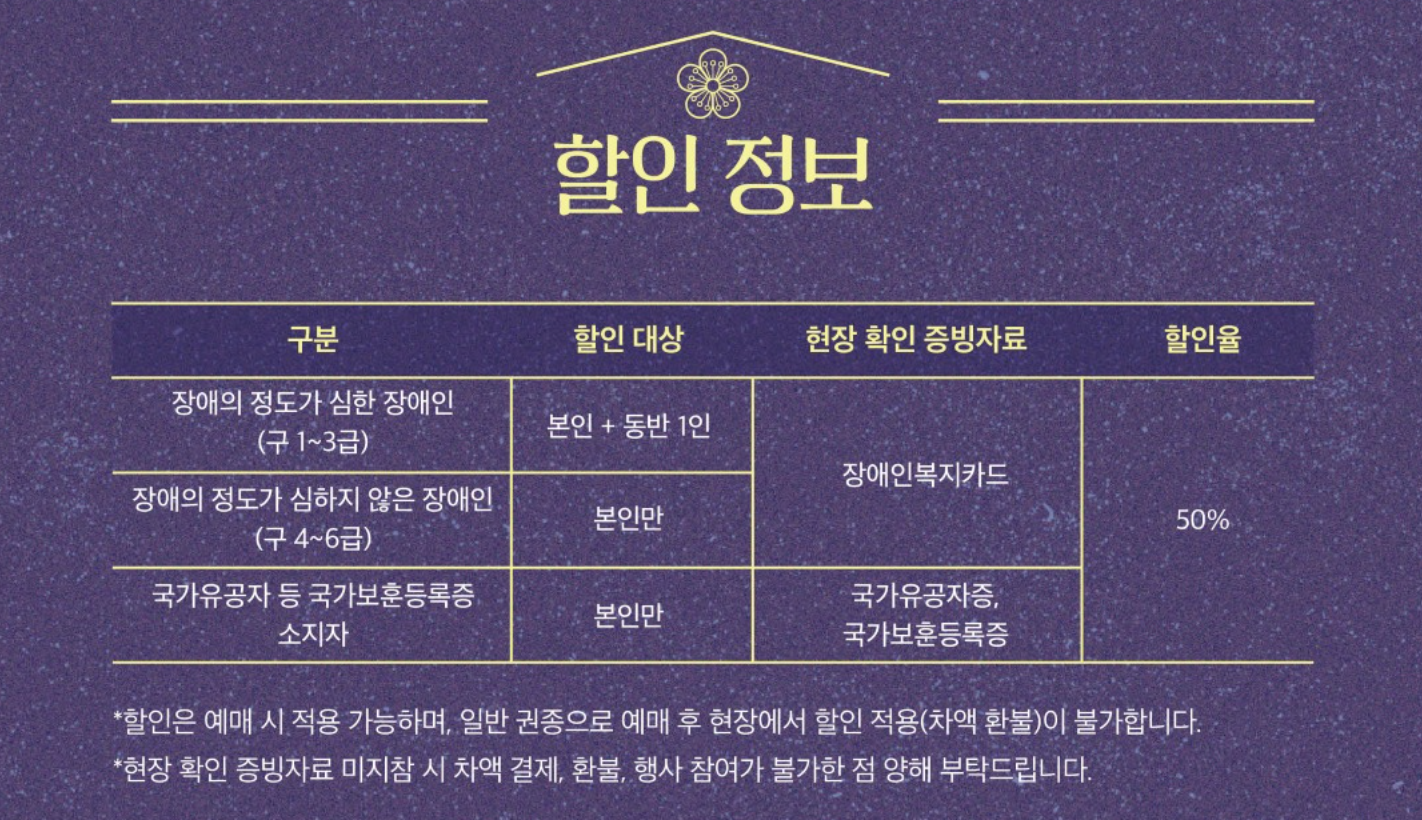 - 🚨 주의사항: 전화 예매 및 할인 티켓은 예매자 본인 참석이 원칙이며, 가족 양도조차 불가능합니다. 현장 방문 시 복지카드나 유공자증 등 실물 증빙자료 미지참 시 입장이 제한됩니다.