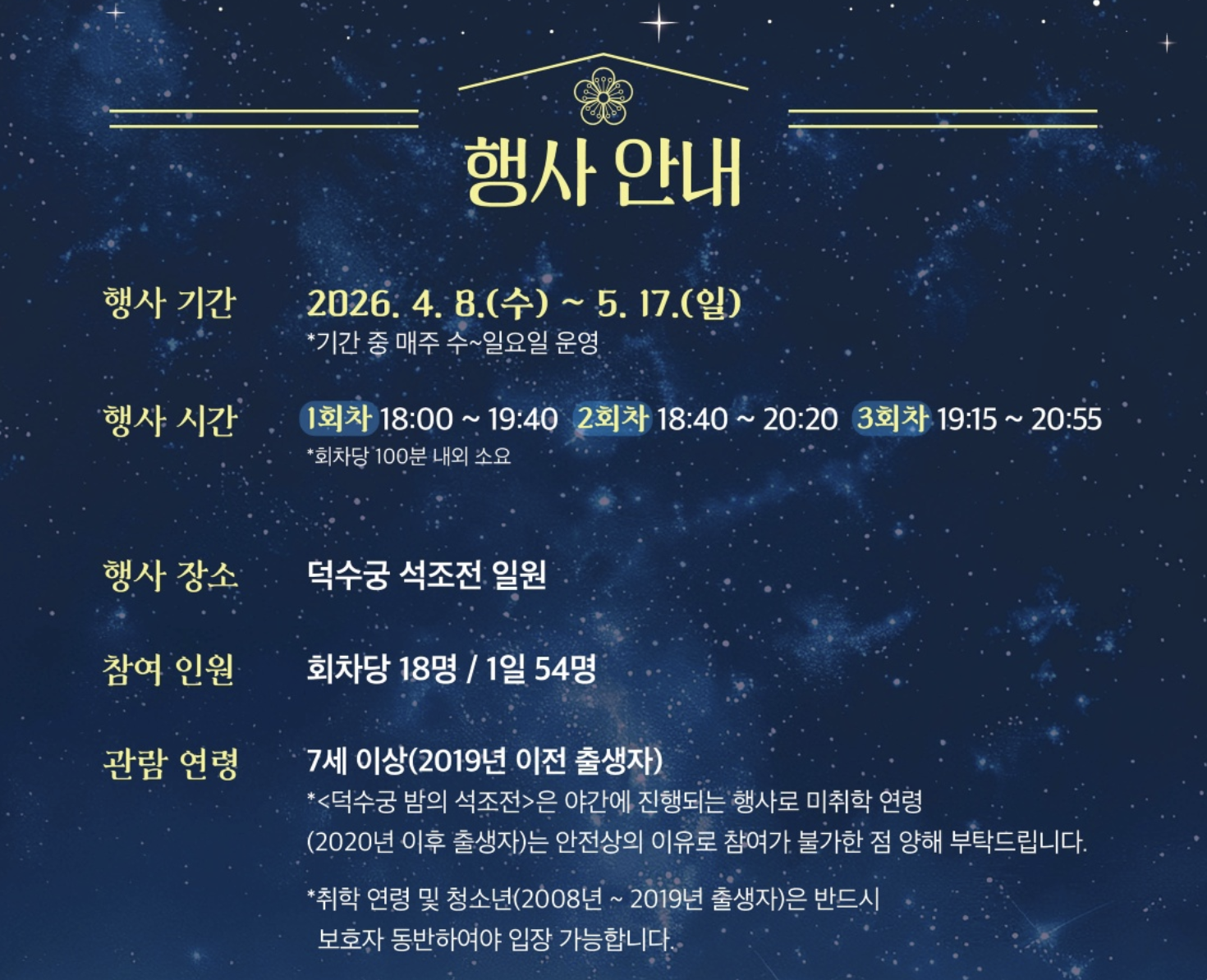 야간 궁궐 내부를 걷는 행사의 안전상 이유로 7세 이상(2019년 이전 출생자)만 관람이 가능합니다. 2020년 이후 출생자는 보호자가 동반해도 절대 입장할 수 없습니다. 취학 연령 및 청소년(2008년~2019년 출생자)은 반드시 성인 보호자가 동반해야 합니다.