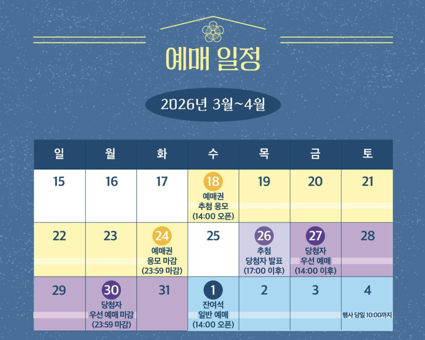 | 3. 당첨자 우선 예매 | ⭐️ 3. 27.(금) 14:00 ~ 3. 30.(월) 23:59 ⭐️ | 당첨자에 한해 선착순 좌석/회차 선택 (1인 최대 2매 결제 가능). 기한 내 미결제 시 당첨 취소 |